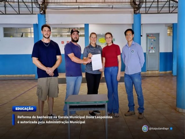A Administração Municipal, em parceria com a Secretaria de Educação, assinou a ordem de serviço para a reforma dos banheiros da Escola Municipal Dona Leopoldina. O investimento total da obra é de R$ 111.950,00, recurso destinado a modernizar as instalações e garantir melhores condições de uso para estudantes.